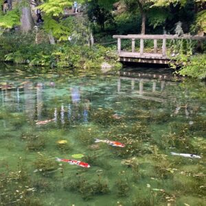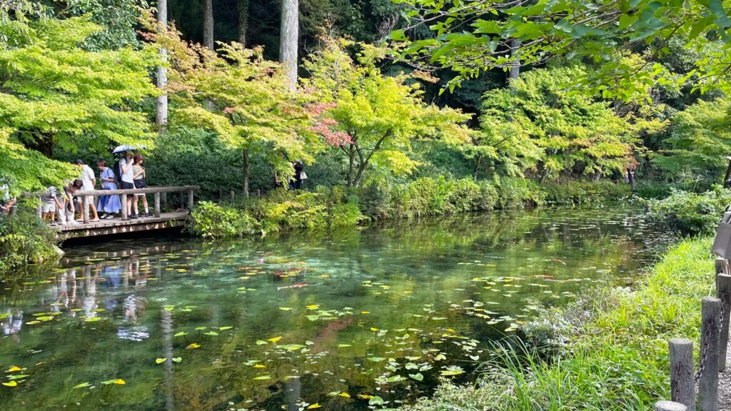 水面が透き通っており、鯉がゆったりと泳ぐ姿と水草がとても幻想的でした!