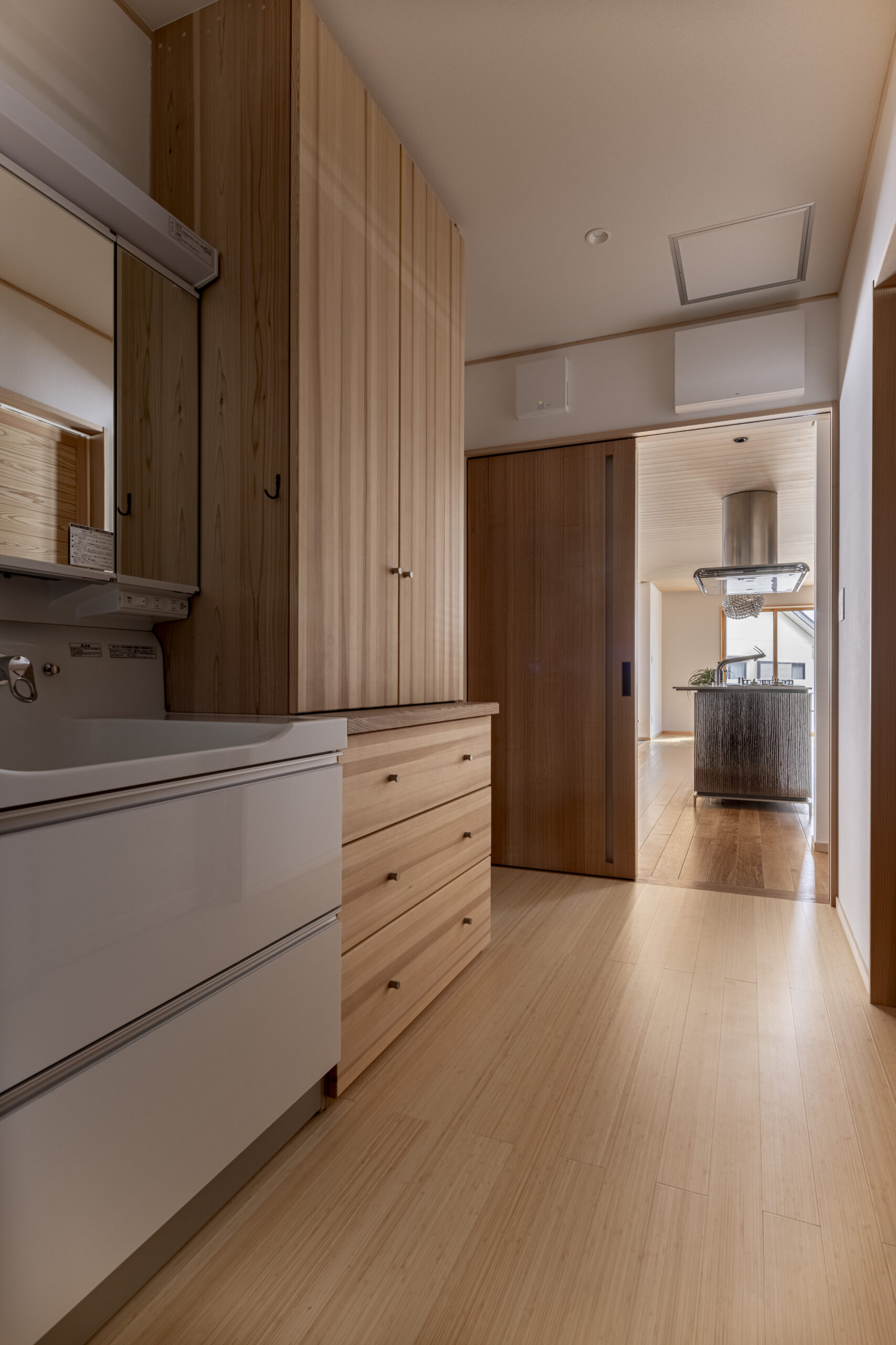 洗面化粧台の延長で収納も兼ねる場合や、独立した洗面収納である場合、ドライヤーやタオルなど日常的なものを収納するのか、ランドリーも兼ね洗剤など収納するのか、水回りの動線によって、どんな収納が使いやすいかを考え提案します。