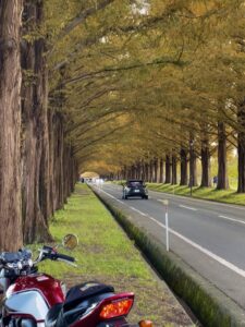 メタセコイヤ並木は、背の高いメタセコイアの木が一直線に並んだ景観スポットで、特に秋になると葉っぱがオレンジ色に染まりとても美しく、多くの人が写真を撮りに訪れる場所となっています