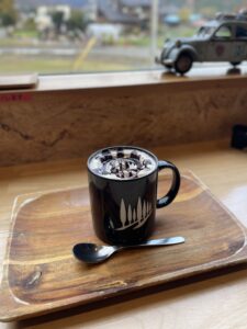この日はとても寒く、山の方では気温5℃と表記されていました。なので休憩がてら、メタセコイア並木周辺のカフェでラテを飲んで温まりました。