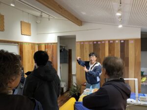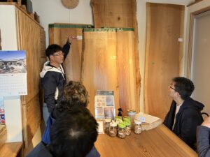 東海製材様を訪問し、内装材や構造材についてそれぞれの用途や特性など細かな説明をしていただきました。