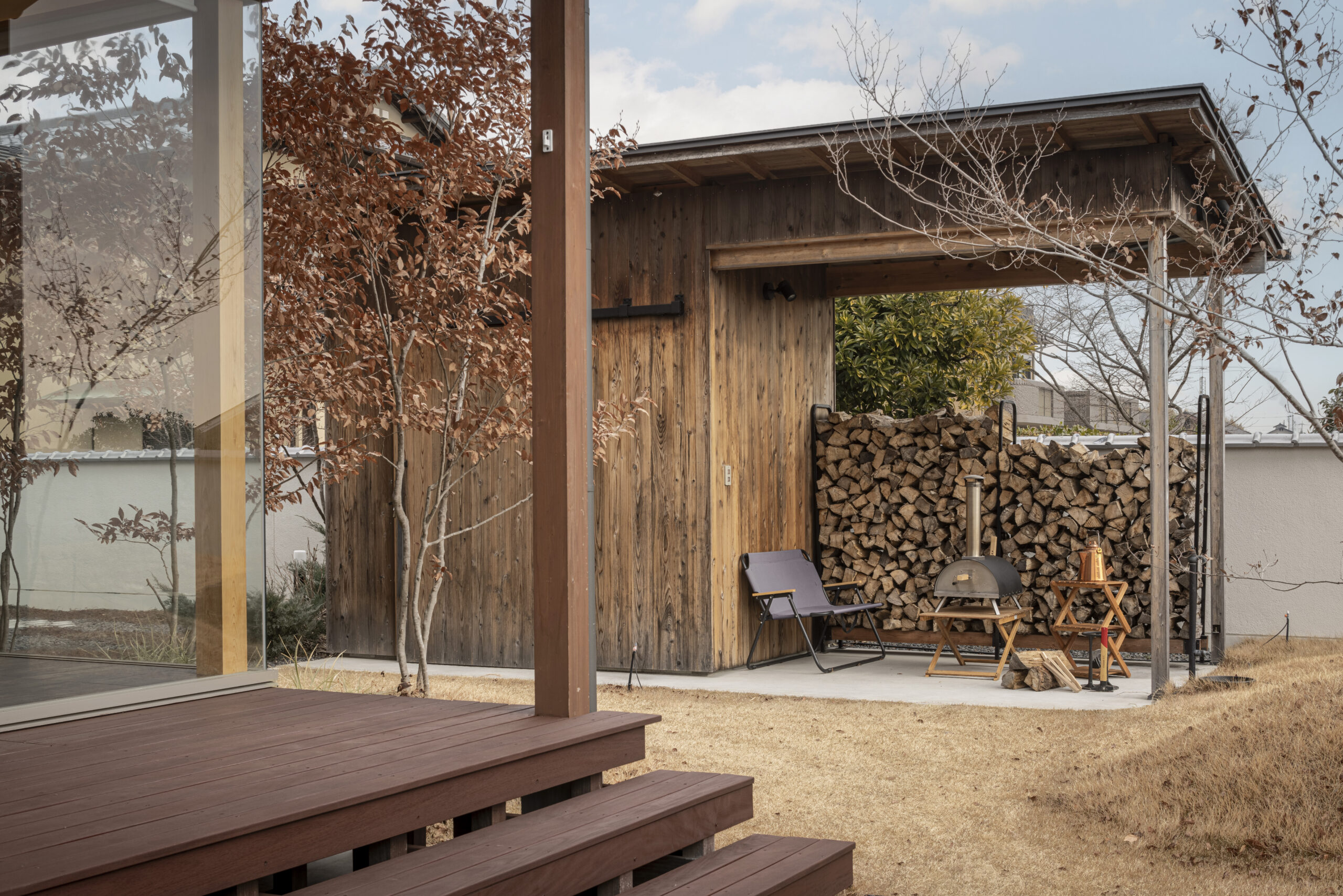 三滝の家では、薪置き場として活用したり、ピザ窯を置いて家族と楽しむアウトドア空間にしたり。