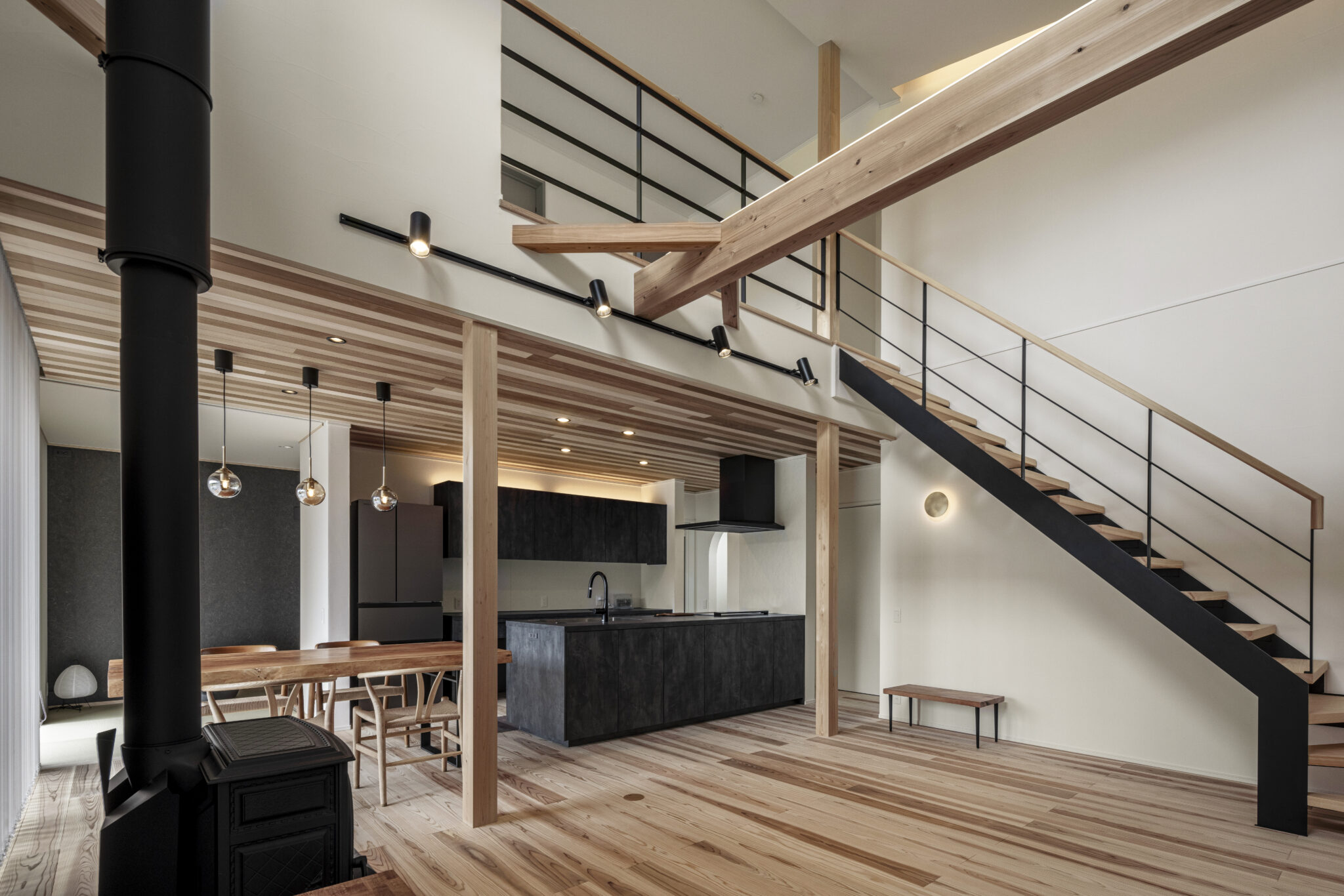 吹き抜けリビングの階段は、家族を近くに感じられ、コミュニケーションが取りやすいメリットがあります。さらに、ストリップ階段であれば、空間を広く見せゆったりと過ごせるリビングになりますし、当社のような木のお家に鉄骨など無機質な素材を用いると、デザイン性もグッと高まりモダンなお家に仕上がります。