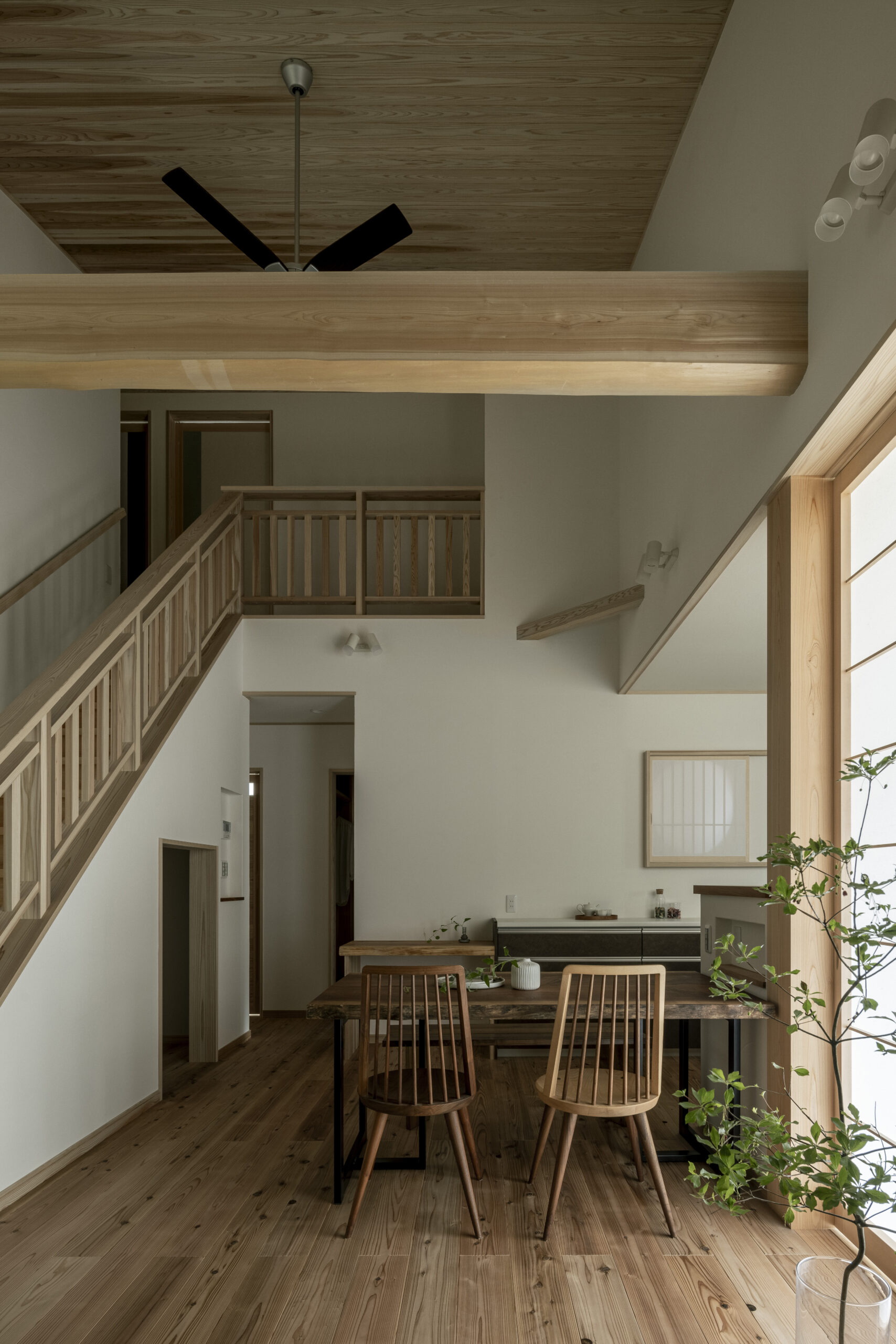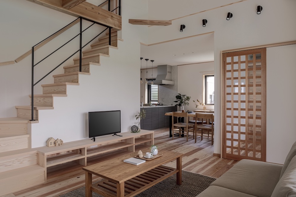 当社が手がけるナチュラルな印象が強い無垢の木の家に、黒い鉄骨の手すりを添えるだけで、和モダンな印象になったり、または、一枚板でさらに無垢の木の階段で、高級旅館のような重厚な印象になったり…。階段1つで、願ったリビングを演出することができるのです。