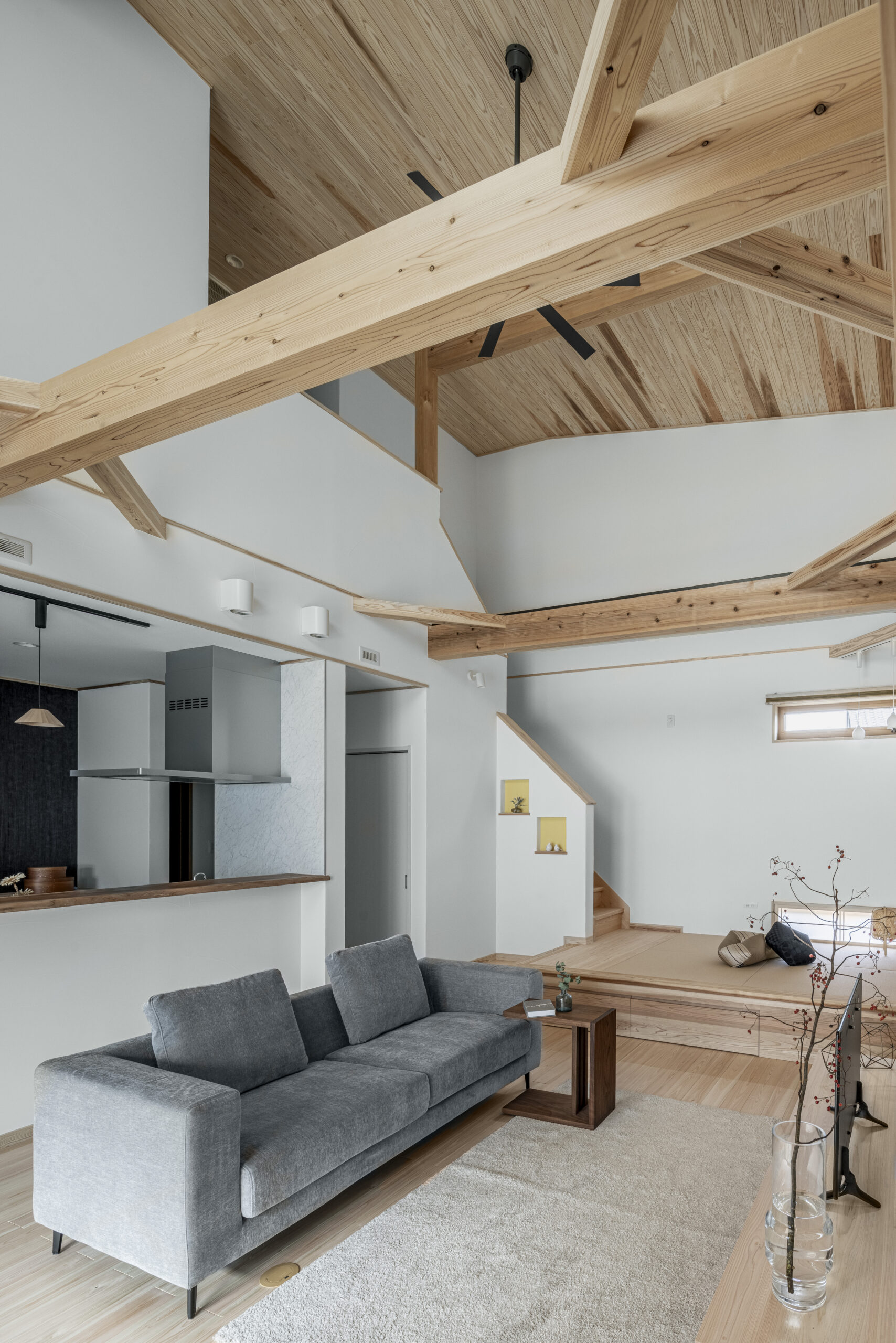 壁で囲まれた階段室タイプの階段では、小上がりの畳スペースの延長に階段を取り付けるなど、使いやすい位置に工夫して配置することができます。階段1つで印象が大きく変わるのです。