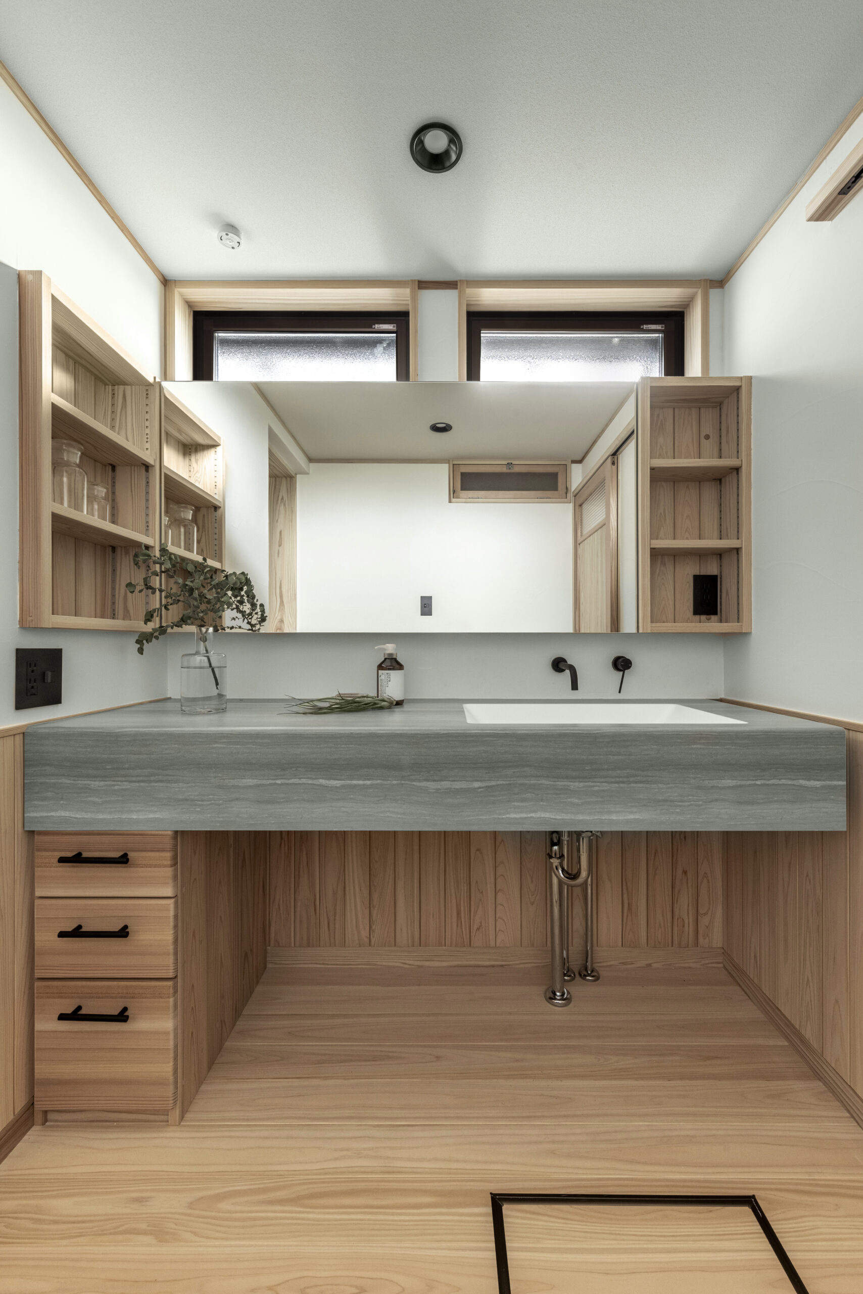 造作洗面台のカウンターには、耐久性と美しさを兼ね備えたアイカ社の素材を採用しました。ゆったりとした幅があるため、2人並んで快適にご使用いただけます。