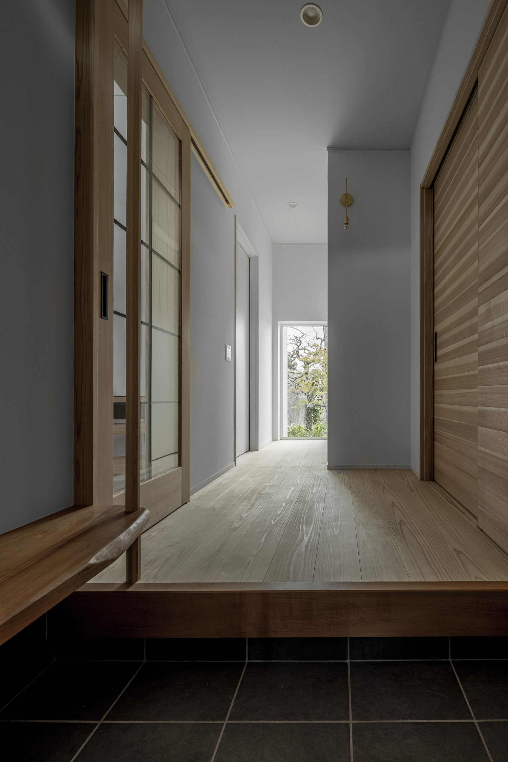 玄関を入ると、その先には庭の木々が見え、まるで一枚の絵のように季節の移ろいを感じさせてくれます。