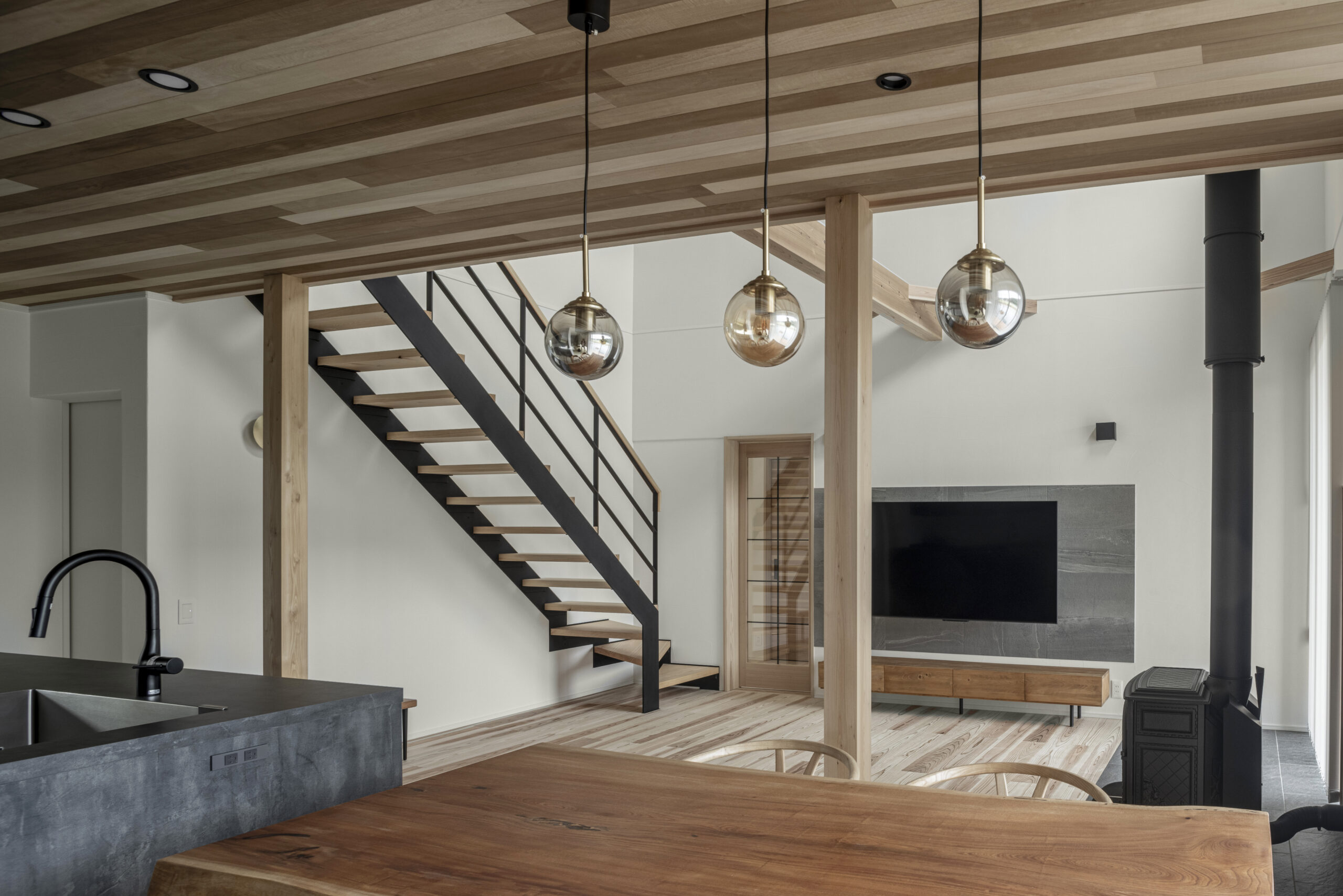 リビングの一角に設けられた薪ストーブは、空間の象徴的な存在。