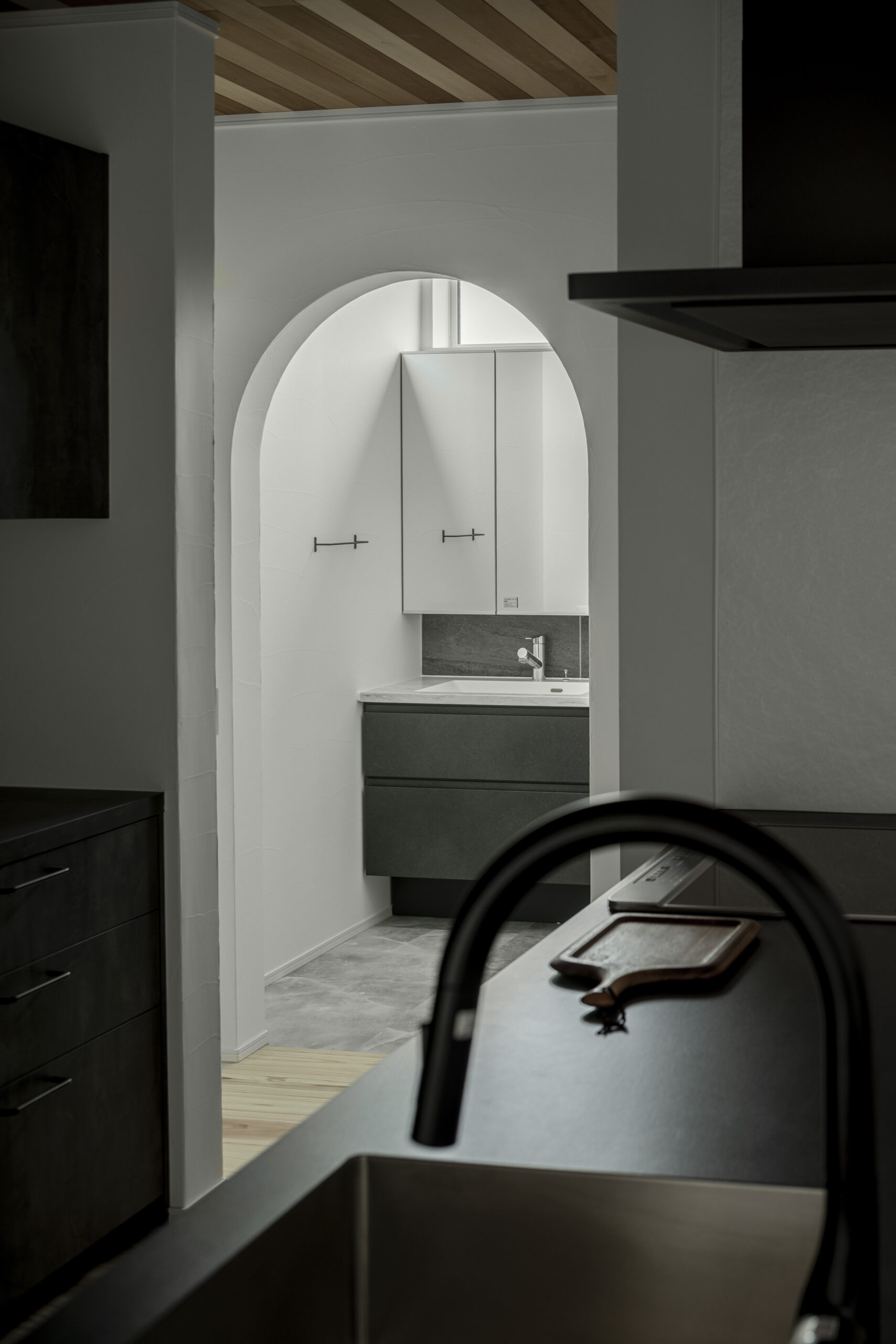 アーチ壁を抜けた先には、水廻りがまとまっています。
