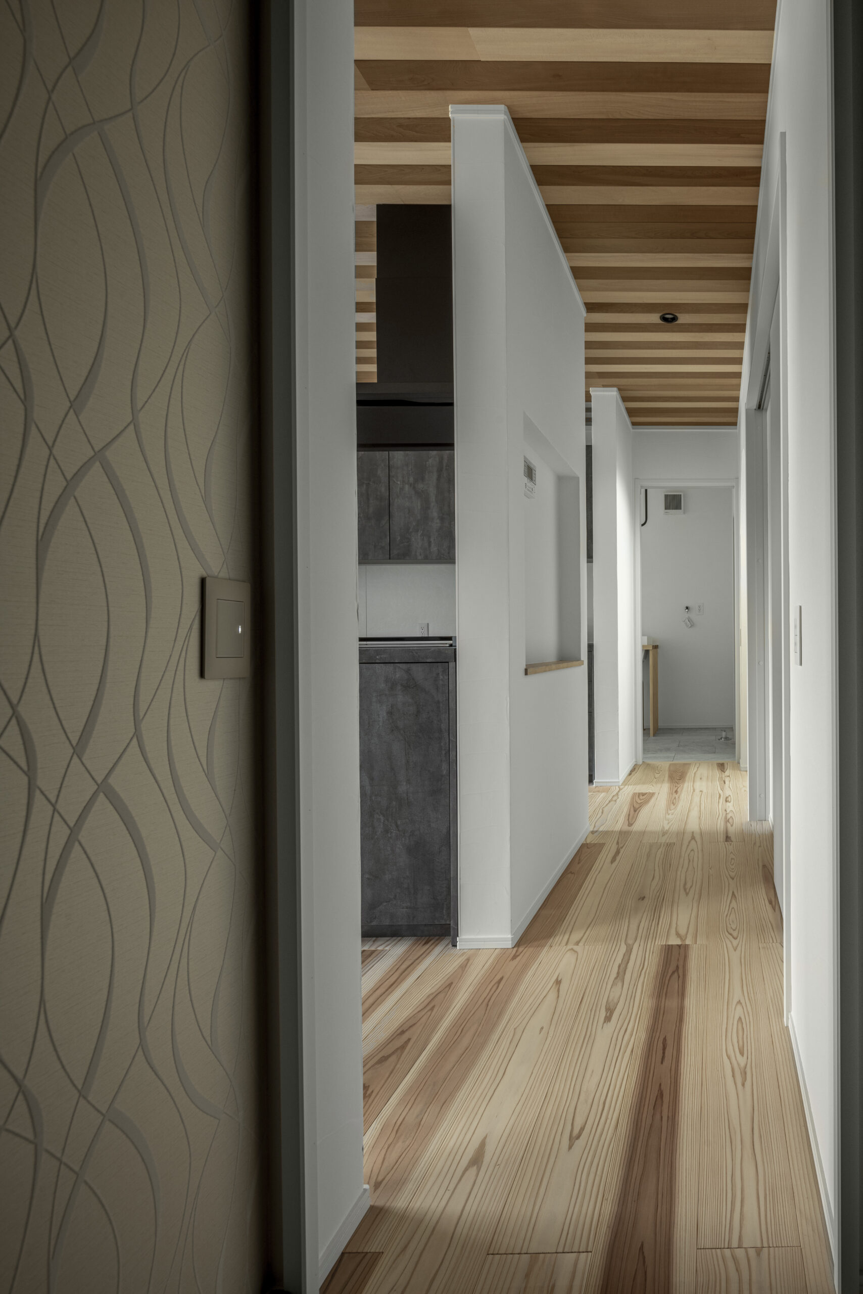自然光が柔らかく廊下を照らし、足元の木の質感をより豊かに引き立てます。