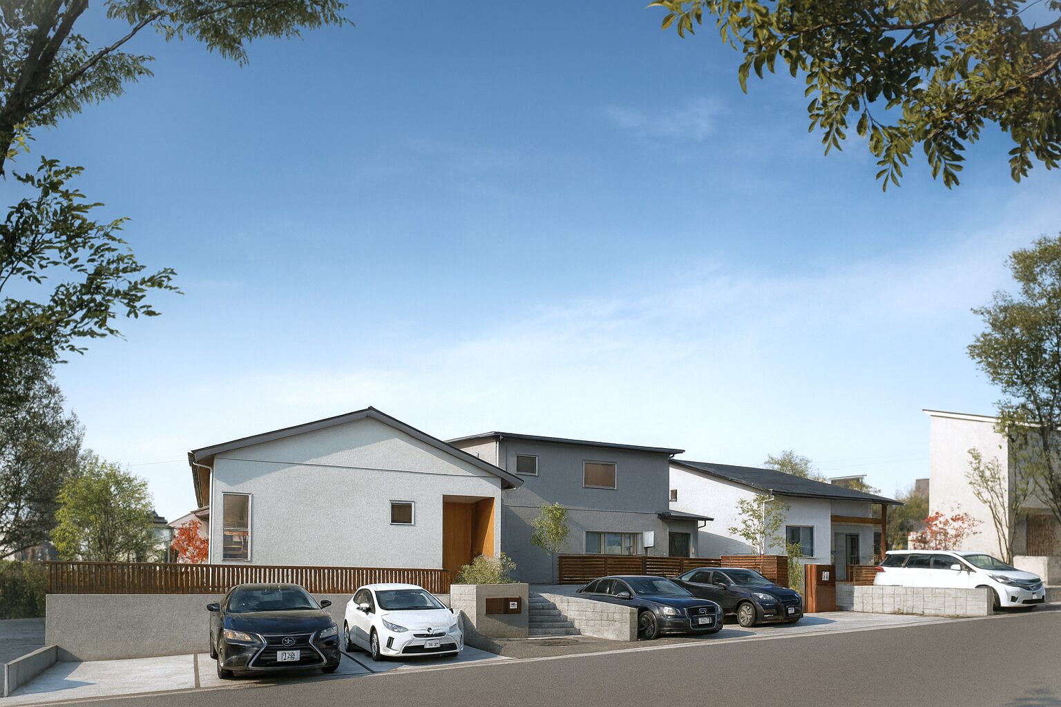 ※大谷台譲地に定額制注文住宅TripleのPLAN06(右)、PLAN05(中)、PLAN08(左)を建築した場合のイメージパース