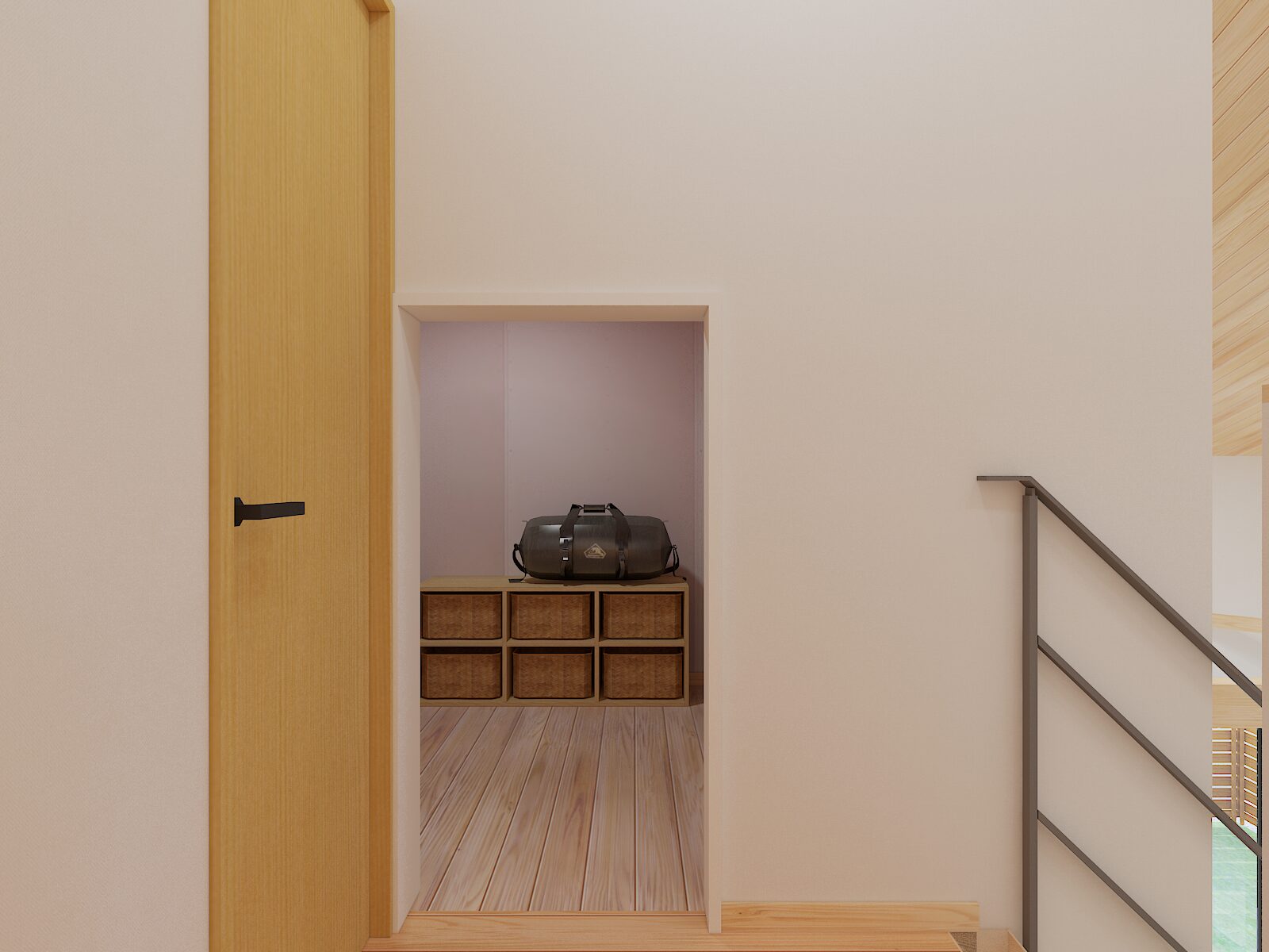 大屋根の形状を活かして小屋裏収納をつくることで、見た目の美しさはそのままに隠せる大容量を実現。