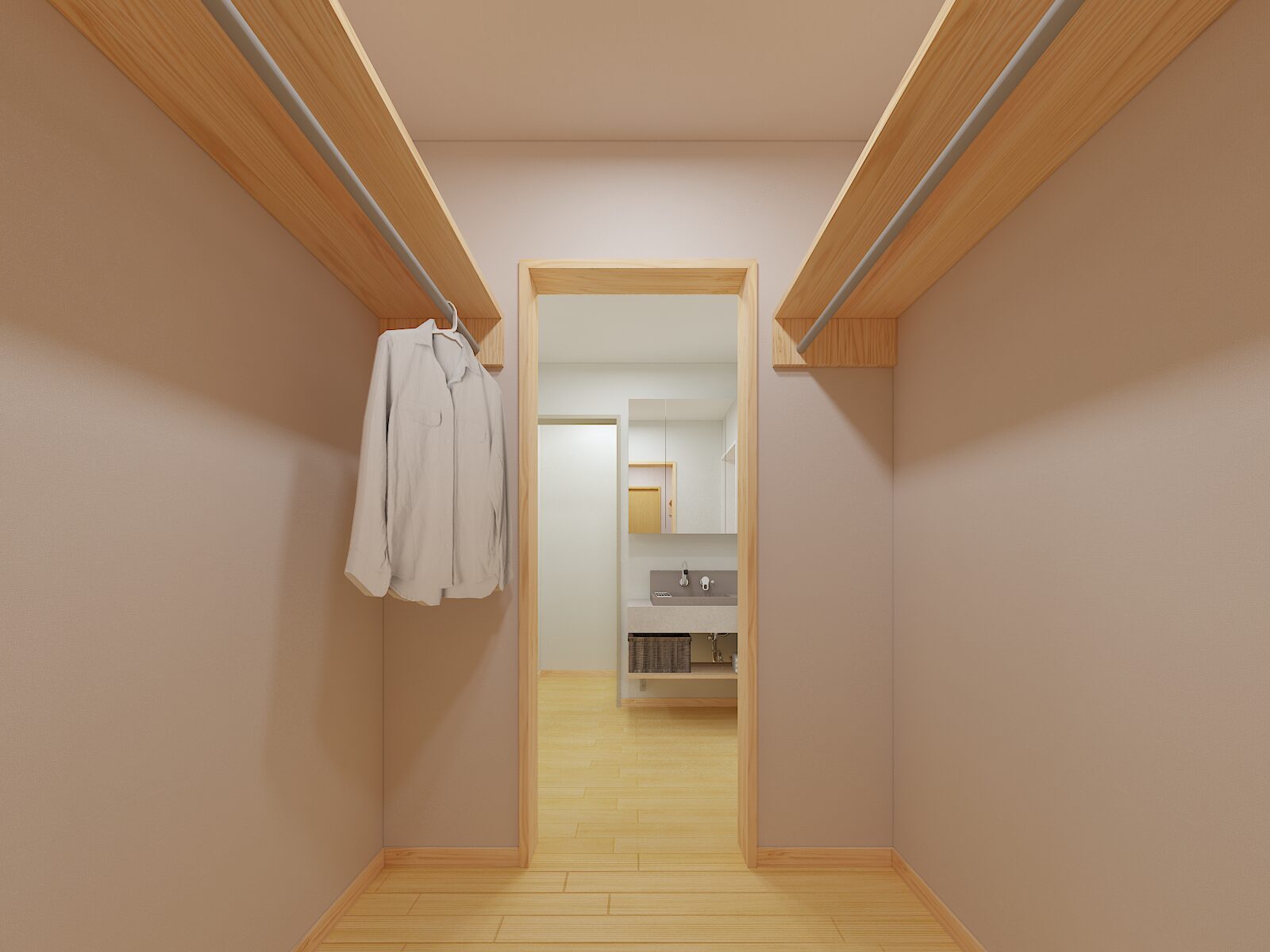 脱衣室・洗面・WICが近接しているため、「その場で干して、その場で片づく」という時短の王道ルートが叶います。
